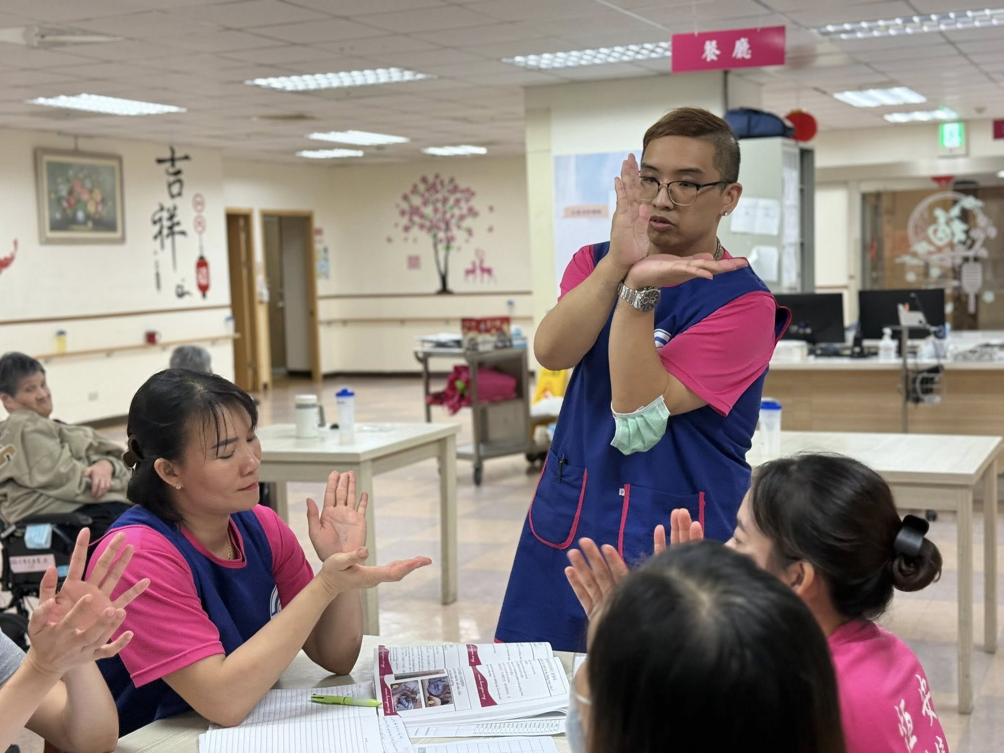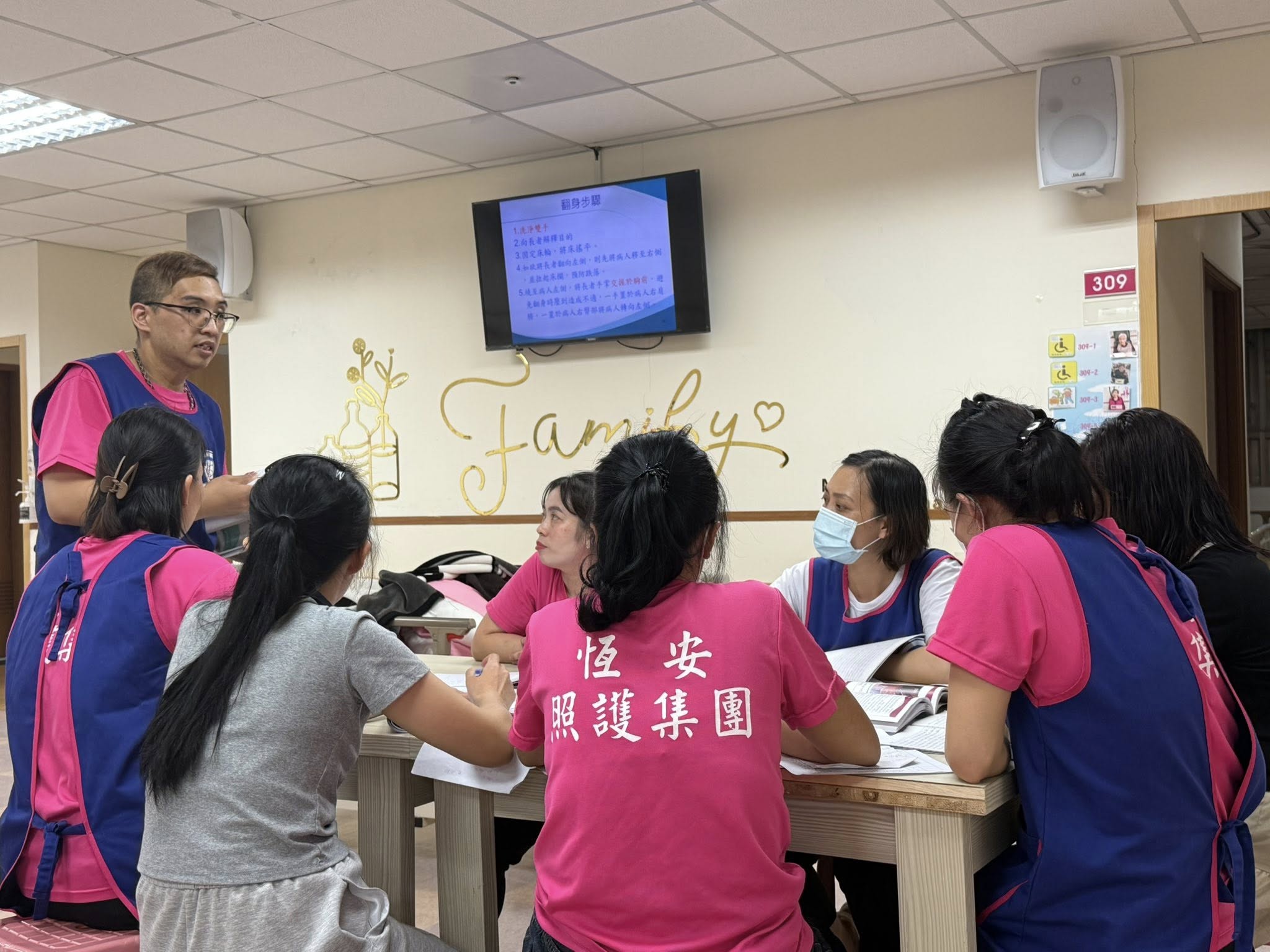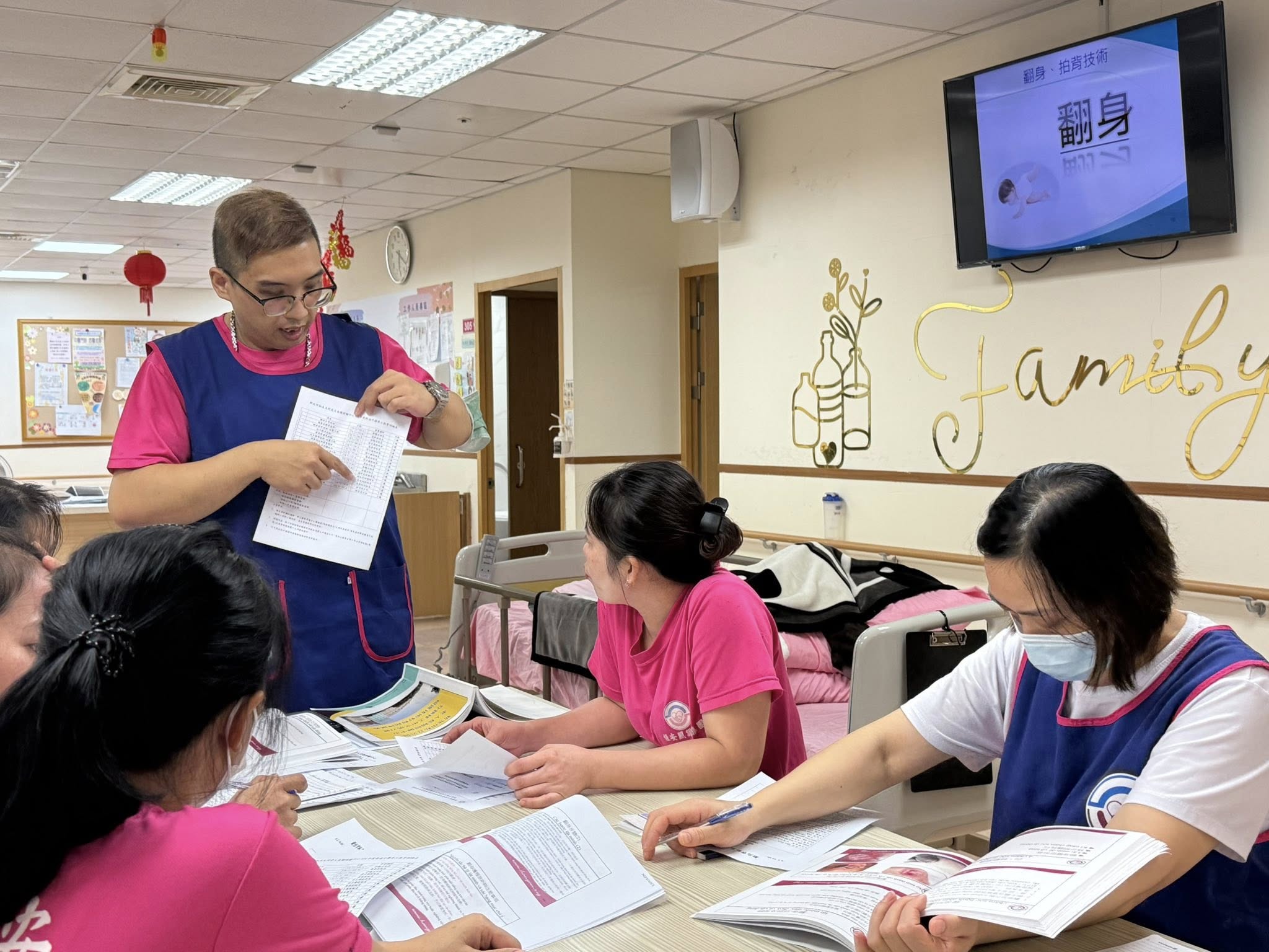 今日由照顧服務員組長 余鎧戎 主講,針對「翻身、拍背標準技術」進行示範與實作教學。